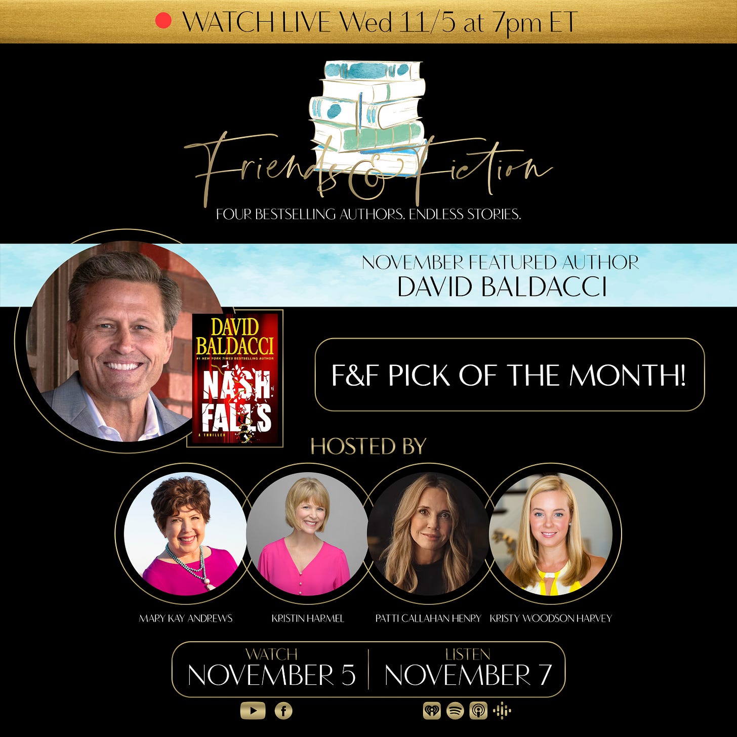 Join us Wednesday, November 5th LIVE at 7pm Eastern on the F&F Facebook page and YouTube channel as the full F&F family gathers to welcome this month’s F&F Featured Author, the award-winning global #1 bestselling David Baldacci to discuss our November 2025 Pick of the Month, his new thriller, Nash Falls, in which Walter Nash’s life is turned completely upside down when he’s recruited by the FBI to bring down a global crime network.